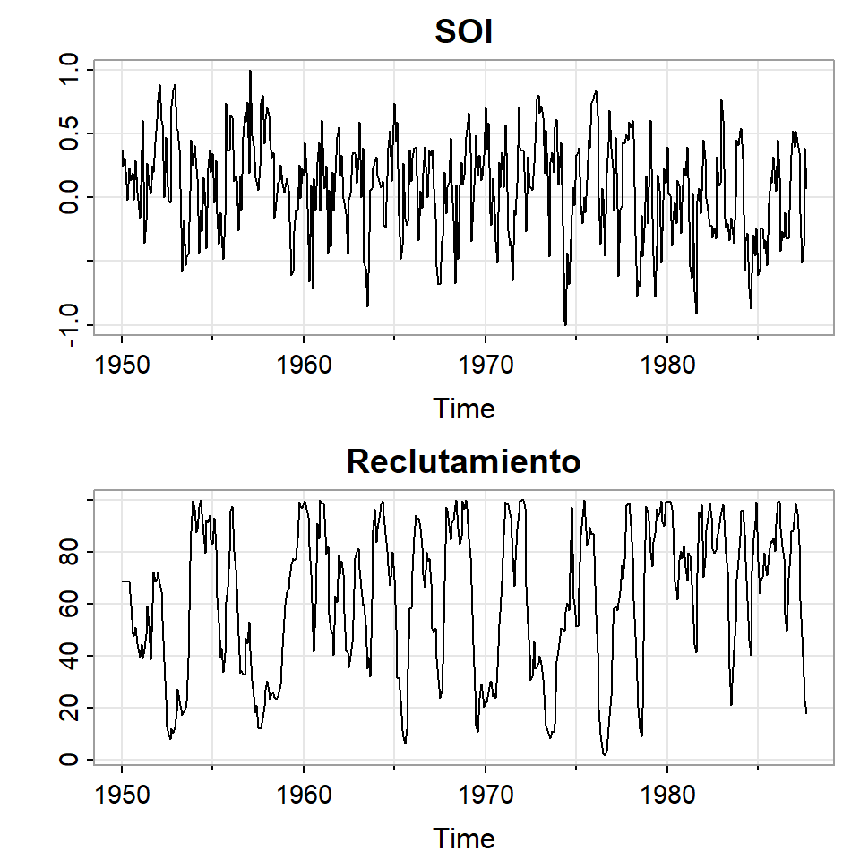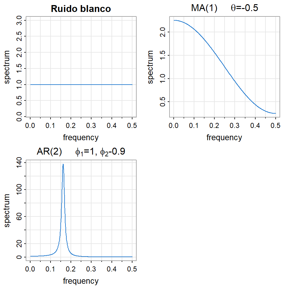 La ACF expresa la información en término de rezagos (tiempo), mientras que la distribución espectral expresa la misma información en término de ciclos (frecuencias).