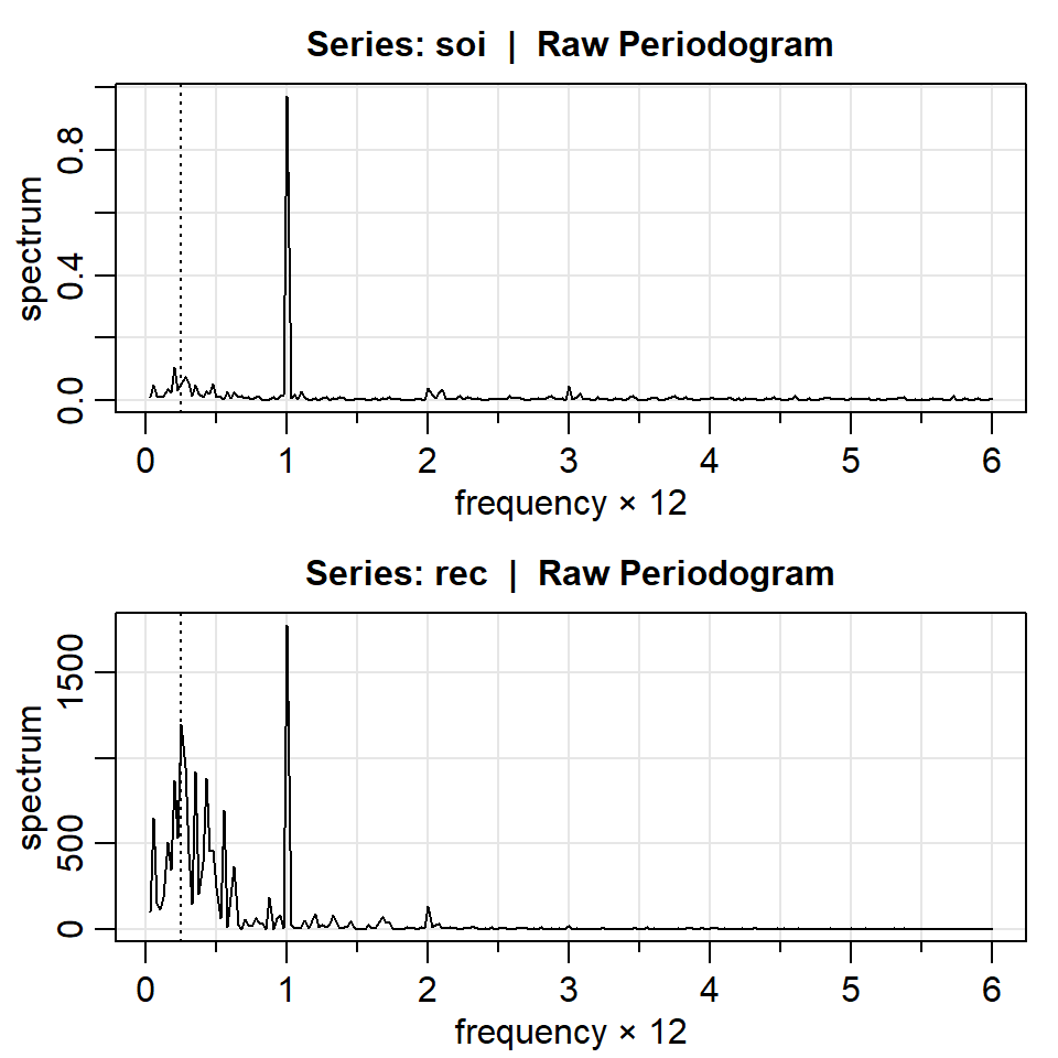 Recuerde que el dominio de frecuencia es \((0,0.5)\). El gráfico muestra las frecuencias transformadas que debe multiplicar por \(12\), y por lo tanto, \((0 \times 12, 0.5 \times 12)=(0,6)\).