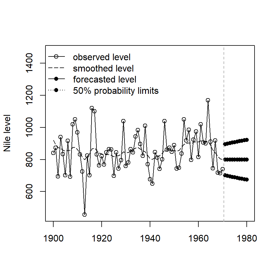 rg <- range(c(fore, window(Nile, start = c(1900, 1))))+c(0,300)