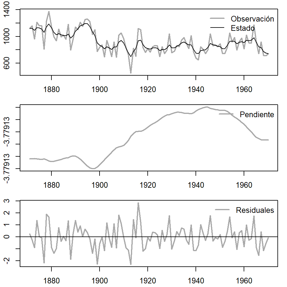 La ecuación de estados consiste en una caminata aleatoria y la ecuación de observaciones consiste en la suma del componente de tendencia y un ruido.