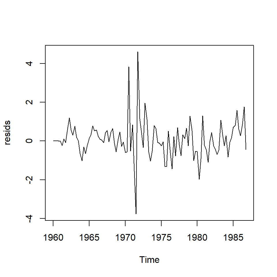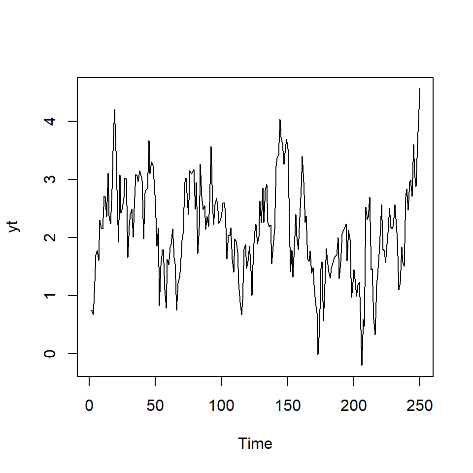 fit1 = dlmMLE(y=yt,parm=c(0,0),build=dlm1,hessian=T)\[F_t=(1,0,...,0),~~~ G=\begin{bmatrix} -1 & -1 & \dots & -1 & -1\\ 1 & 0 & \dots & 0 & 0\\ 0 & 1 & \dots & 0 & 0\\ \vdots & \vdots & \ddots & 0 & 0\\ 0 & 0 & \dots & 1 & 0 \end{bmatrix}\]