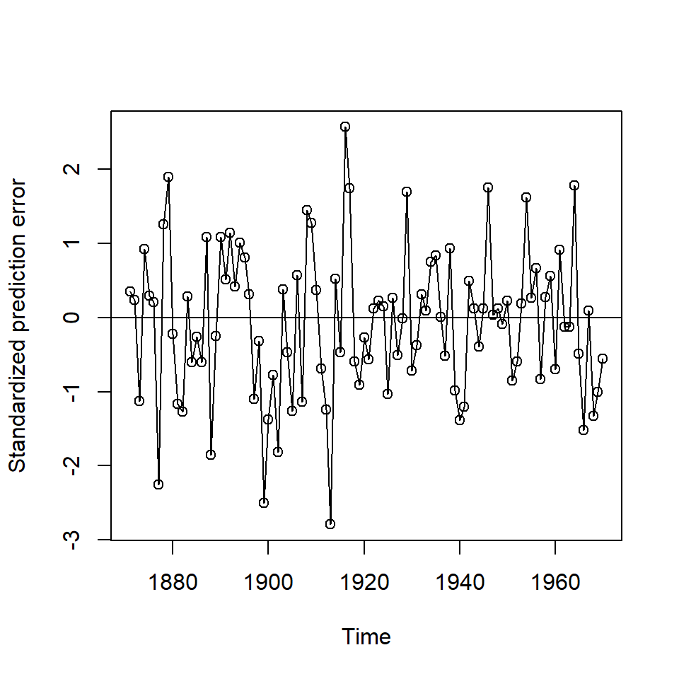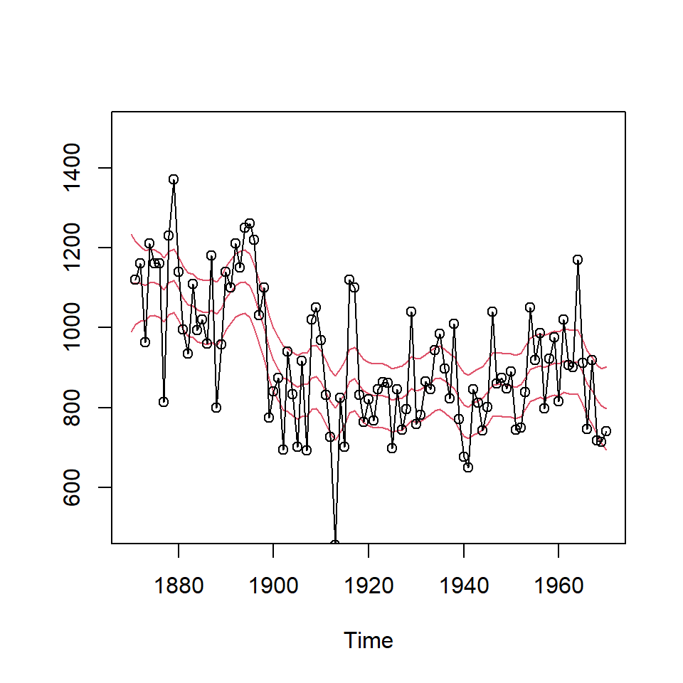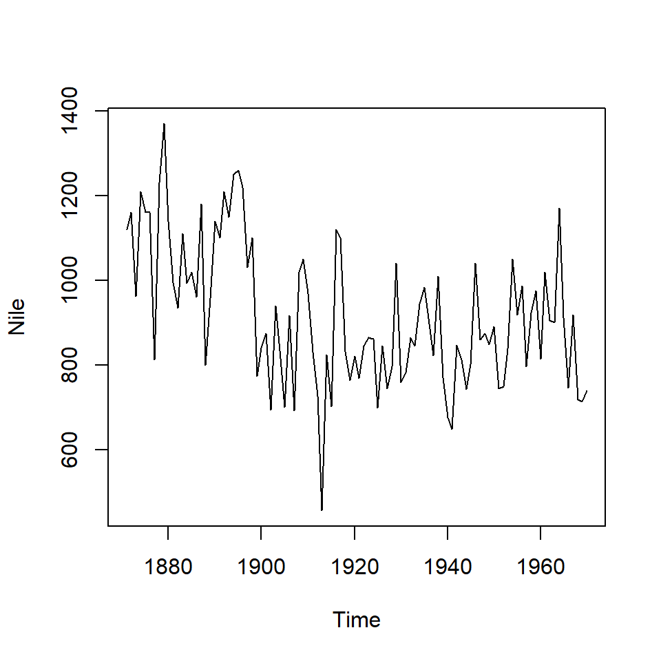dlmModPolyMediciones del caudal anual del Nilo en Asuán, Egipto., 1871–1970, en \(10^8 m^3\),