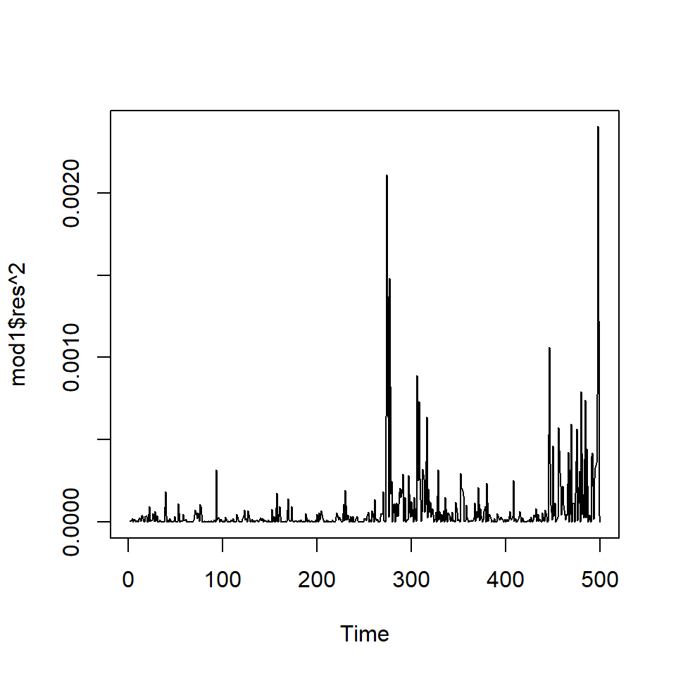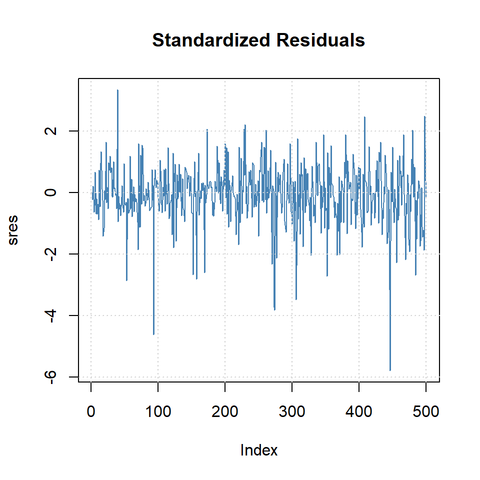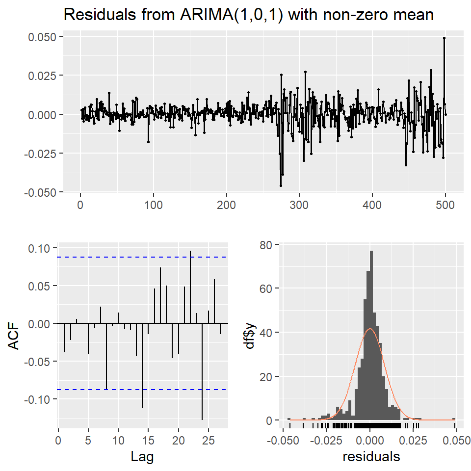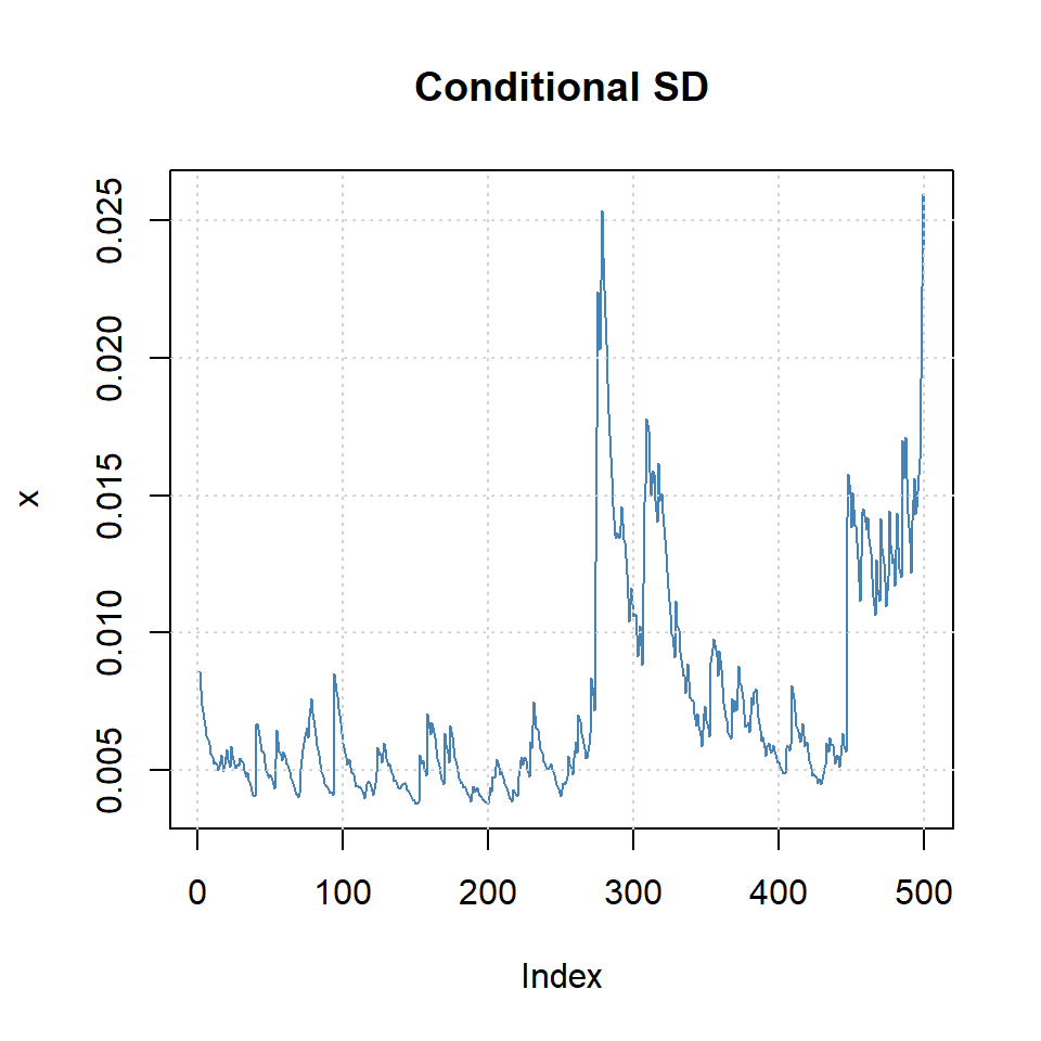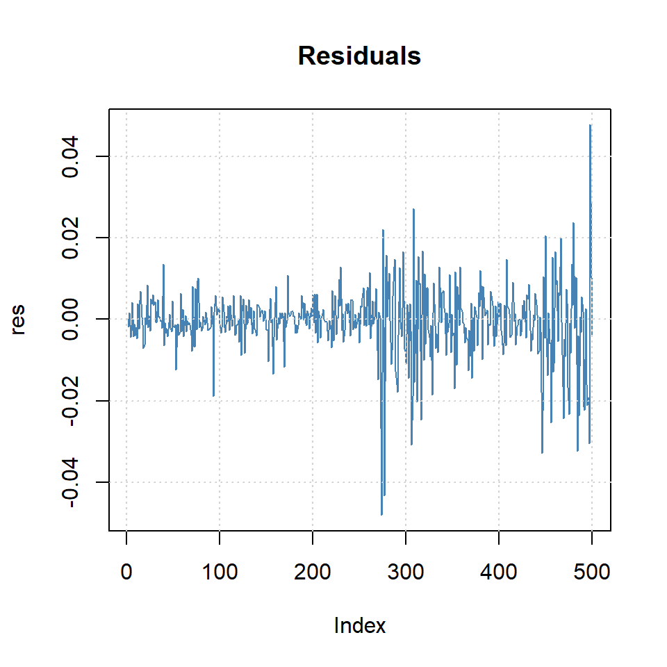 \[r_t= 0.0015 -0.59 r_{t-1} + \varepsilon_t + 0.59 \varepsilon_{t-1}\] \[\varepsilon_t=\sqrt{h_t} \epsilon_t\] \[h_t= 0.0000017 + 0.16 \varepsilon_{t-1}^2 + 0.83 h_{t-1}\]