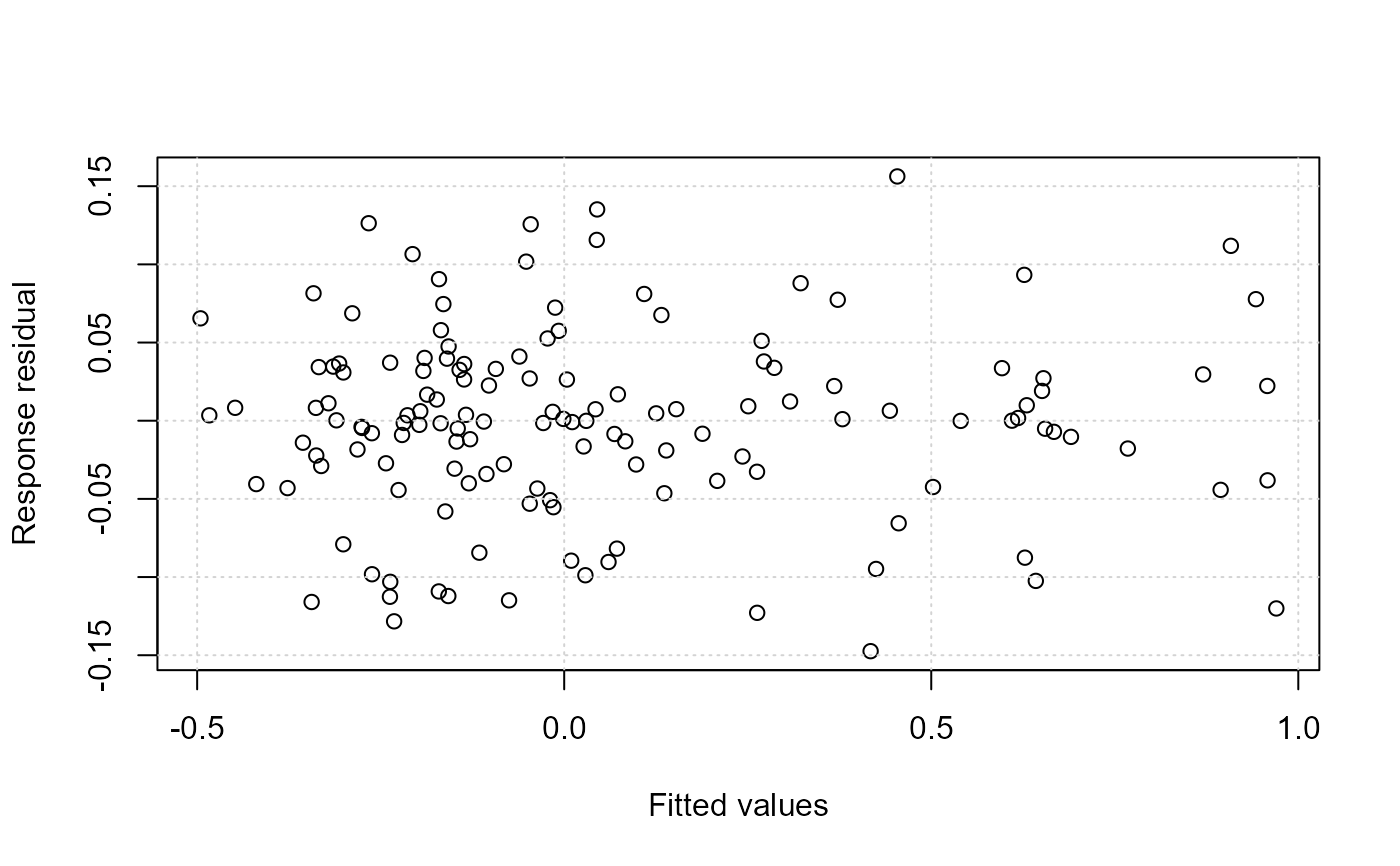 Return an interactive menu with eleven options to make plots. This menu contains the follows graphics: 1: Response residuals against fited values. 2: Response residuals against time index. 3: Histogram of Response residuals. 4: Autocorrelation function of response residuals. 5: Partial autocorrelation function of response residuals. 6: Conditional quantile residuals against fited values. 7: Conditional quantile residuals against time index. 8: Histogram of conditional quantile residuals. 9: Autocorrelation function of conditional quantile residual. 10: Partial autocorrelation function of conditional quantile residuals. 11: QQ-plot of conditional quantile residuals.