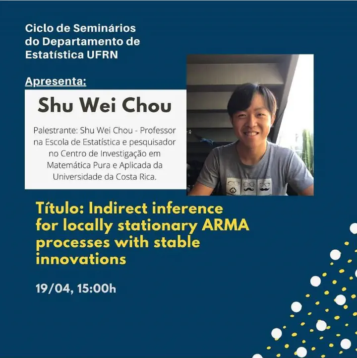 Indirect inference for locally stationary ARMA processes with stable innovations abr. 19, 2021 Seminário. Departamento de Estatística, UFRN, Brasil. Shu Wei Chou Chen Profesor Mis intereses de investigación incluyen los métodos estadísticos, el análisis de series temporales y el análisis espacio-temporal.
