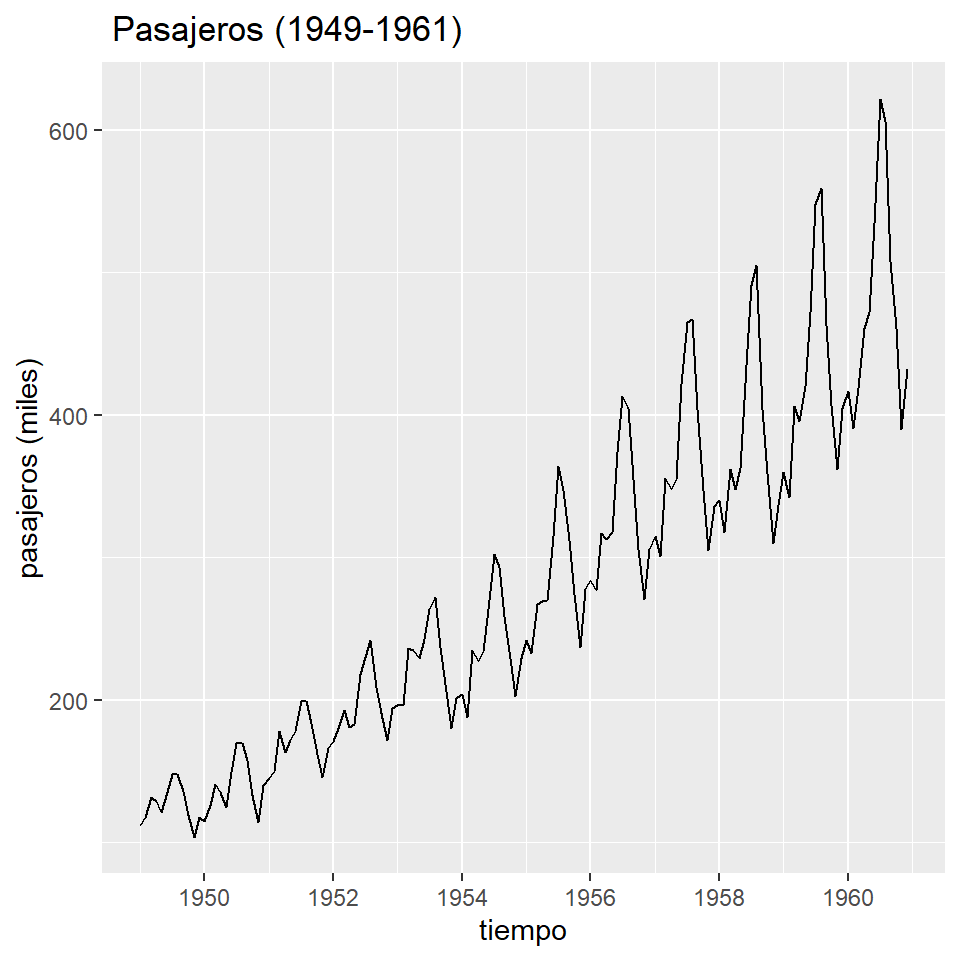 forecast::autoplot(AP.ts) + labs(x ="tiempo", y = "pasajeros (miles)", title=" Pasajeros (1949-1961)")