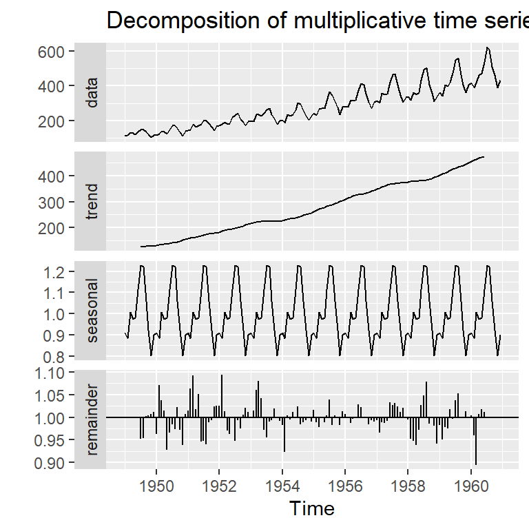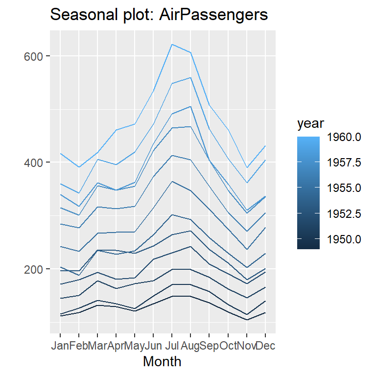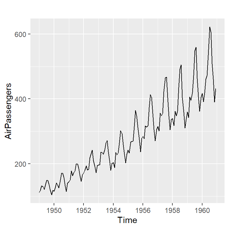 La base de datos AirPassenger en R proporciona total de pasajeros mensuales de una aerolínea estadounidense de 1949 a 1960.