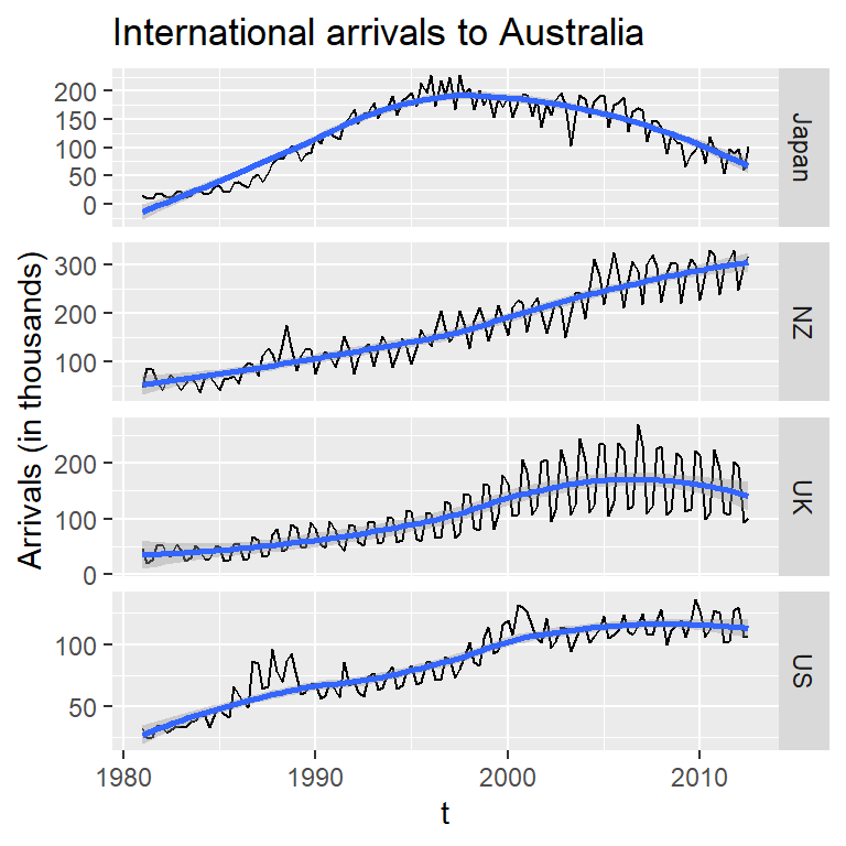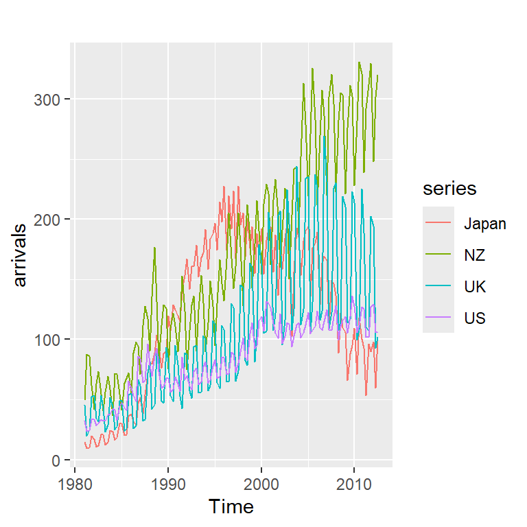 fpp2::arrivals tiene los datos de llegadas internacionales a Australia por cuatrimestre (en miles), desde Japón, Nueva Zelanda, Reino Unido y Estados Unidos.
