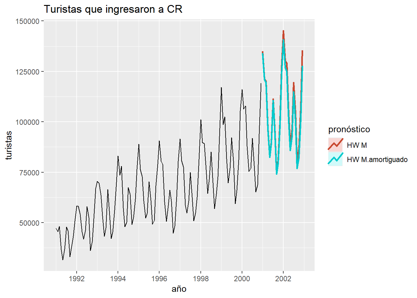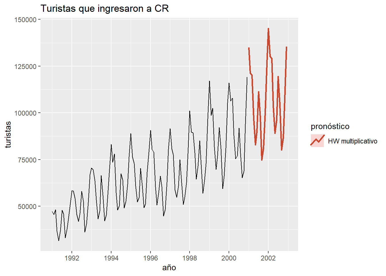 autolayer(ht1, series="HW multiplicativo", PI=FALSE, size = 1) +