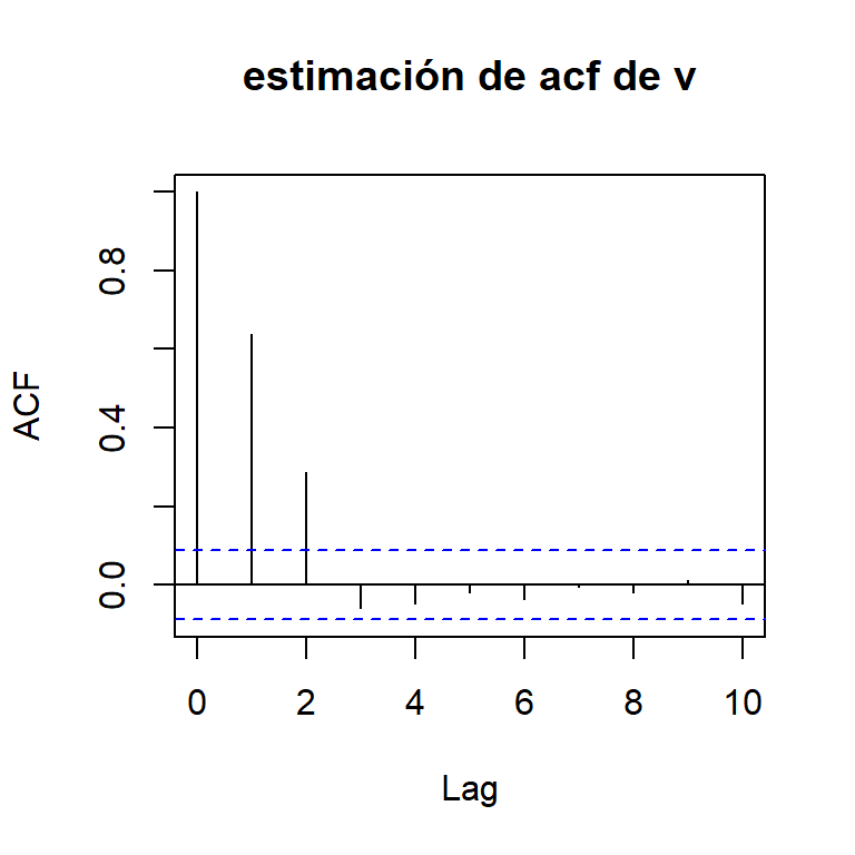 La función de autocorrelación es \[ \rho_v(h)=\left\lbrace \begin{aligned} 1, & & h = 0 \\ \frac{2}{3}, & & |h| = 1 \\ \frac{1}{3}, & & |h| = 2 \\ 0, & & |h| > 2, \end{aligned} \right. \]
