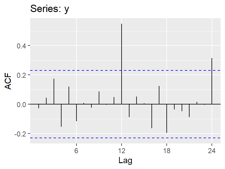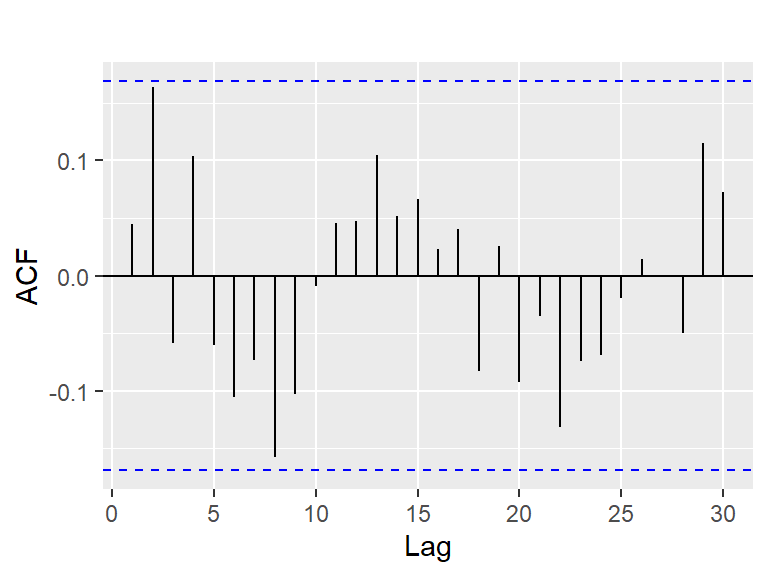 \[\begin{align*} \hat{\rho}_X(h) &= r_X(h) = r_h \\ &= \frac{\hat{\gamma}_X(h)}{\hat{\gamma}_X(0)} = \frac{\sum\limits_{t=1}^{T-h} (X_{t+h}-\bar{X})(X_t-\bar{X})} {\sum\limits_{t=1}^{T} (X_t - \bar{X})^2} \end{align*}\]