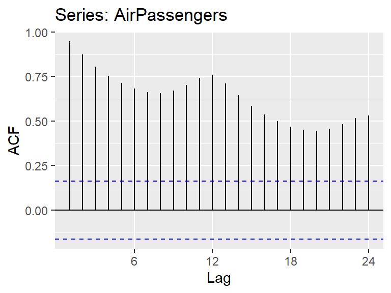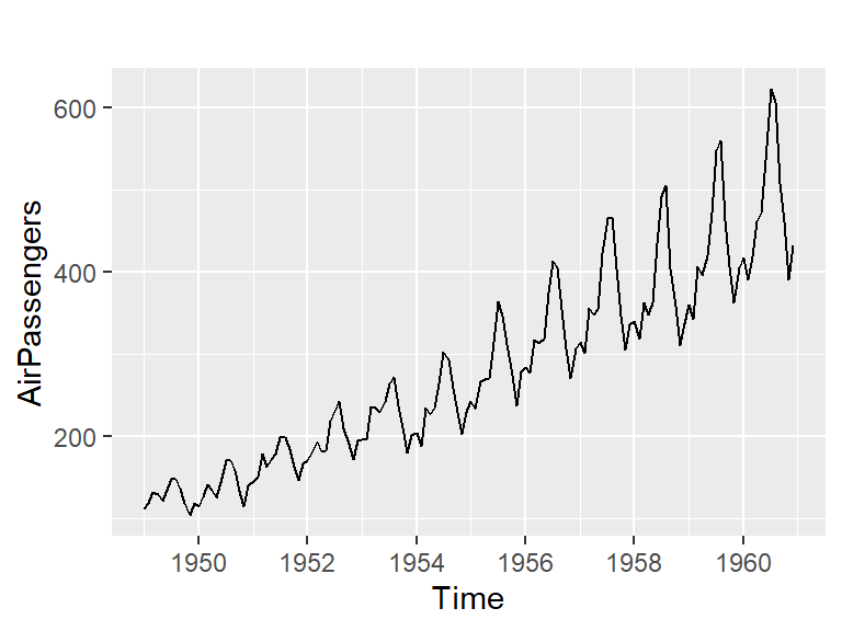 La base de datos “AirPassenger” en R proporciona total de pasajeros mensuales de una aerolínea estadounidense de 1949 a 1960.