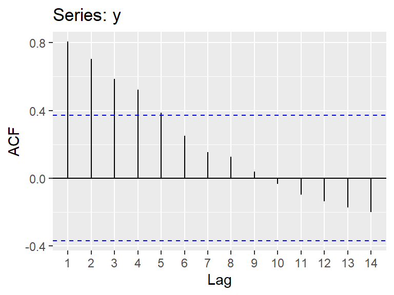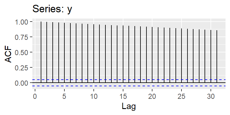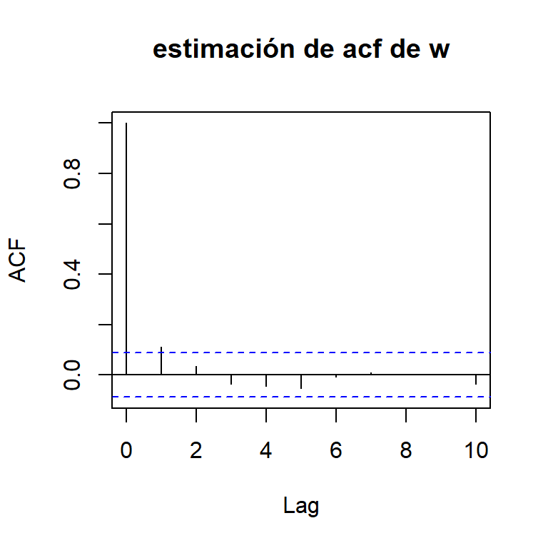 \[r_1=\frac{\sum\limits_{t=1}^{T-1} (X_{t+1}-\bar{X}_1)(X_{t}-\bar{X}_2)}{\sqrt{\sum\limits_{t=1}^{T-1} (X_{t+1}-\bar{X}_1)^2 \sum\limits_{t=1}^{T-1} (X_{t}-\bar{X}_2)^2}}\] donde \(\bar{X}_1\) es la media de los \(T-1\) últimos valores de la serie y \(\bar{X}_2\) es la media de los \(T-1\) primeros valores de la serie.