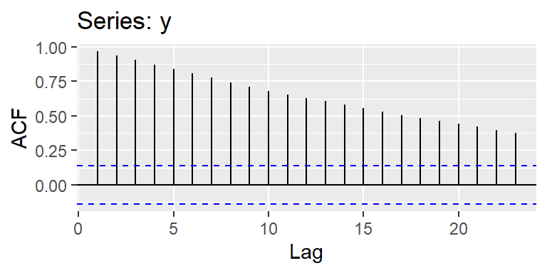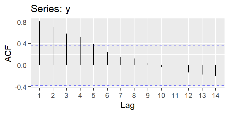 Entonces, la función de autocovariancia muestral es definida por \[\hat{\gamma}_X(h)=\frac{1}{T}\sum_{t=1}^{T-h} (X_{t+h}-\bar{X})(X_{t}-\bar{X}),\] con \(\hat{\gamma}_X(-h)=\hat{\gamma}_X(h)\) para \(h=0,1,...,T-1\).