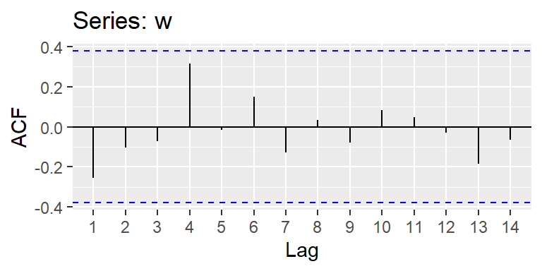 La función de autocorrelación es dada por: \[ \rho_w(t,t+h)=\left\lbrace \begin{aligned} 1, & & h = 0 \\ \frac{2}{3}, & & |h| = 1 \\ \frac{1}{3}, & & |h| = 2 \\ 0, & & |h| > 2, \end{aligned} \right. \]