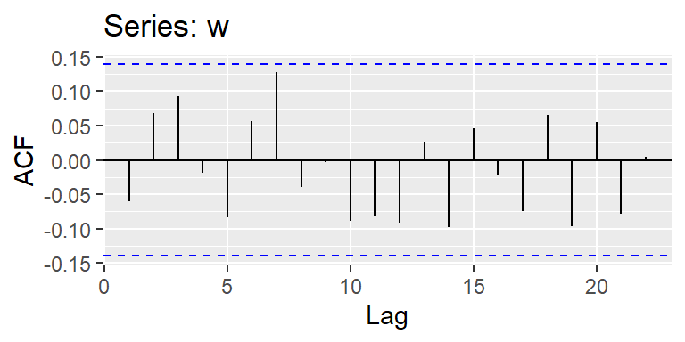 Entonces, \[\gamma_w(t,t+h)=\left\lbrace \begin{aligned} \frac{3}{9}\sigma_w^2, & & h = 0 \\ \frac{2}{9}\sigma_w^2, & & |h| = 1 \\ \frac{1}{9}\sigma_w^2, & & |h| = 2 \\ 0, & & |h| > 2. \end{aligned} \right.\]