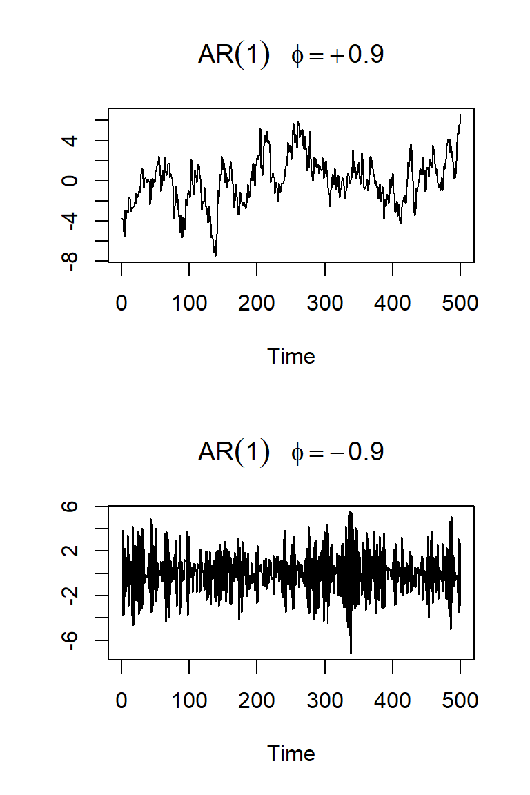 Veamos dos realizaciones de \(T=500\) de cada caso: \(\phi=0.9\) y \(-0.9\).