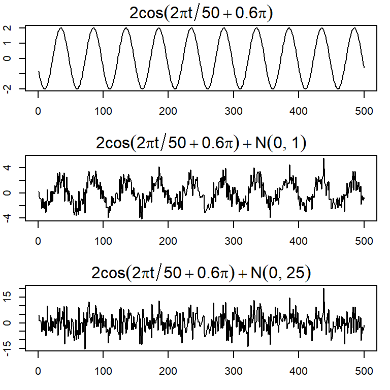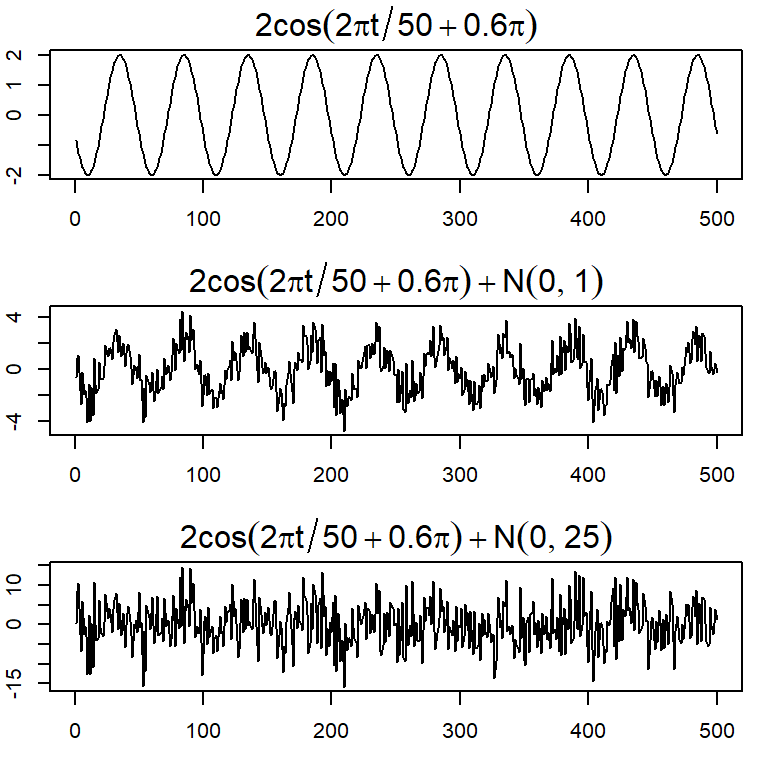 Considere \(x_t=2 \cos \left( 2 \pi \frac{t+15}{50} \right)+ w_t\) para \(t=1,...,500\).