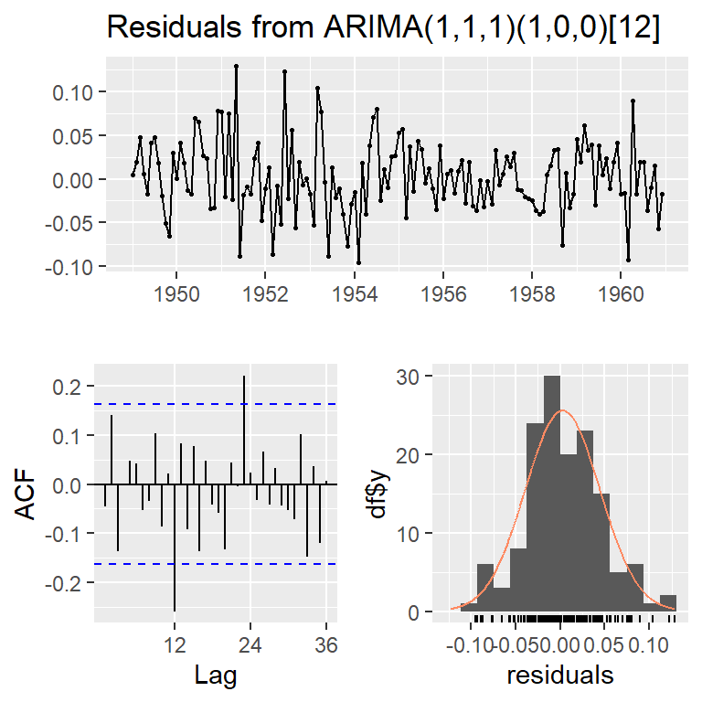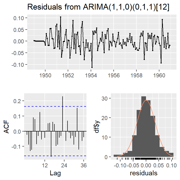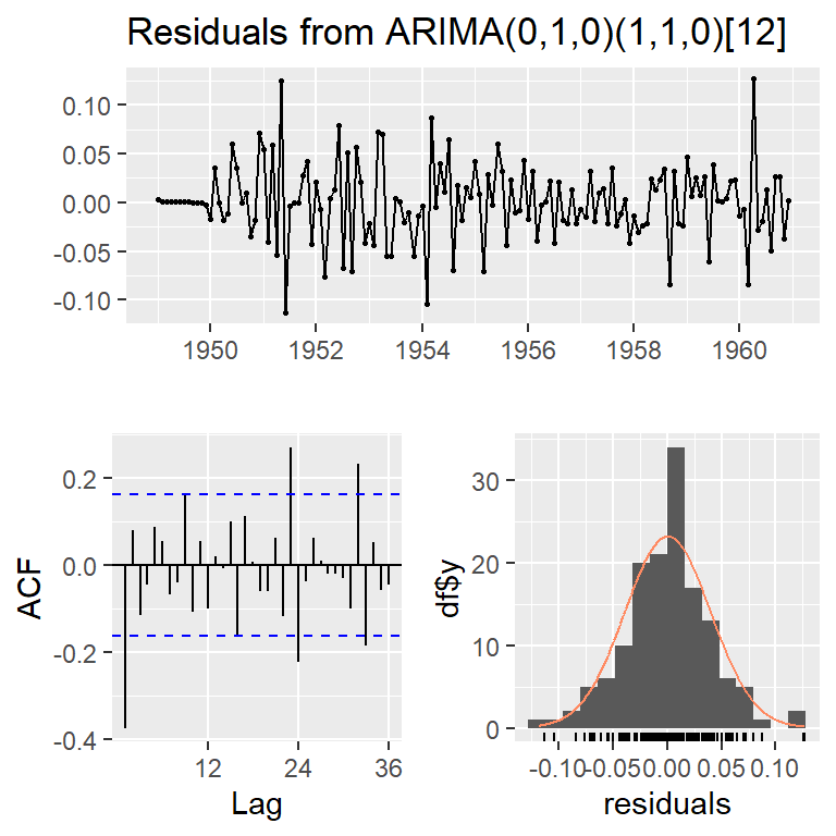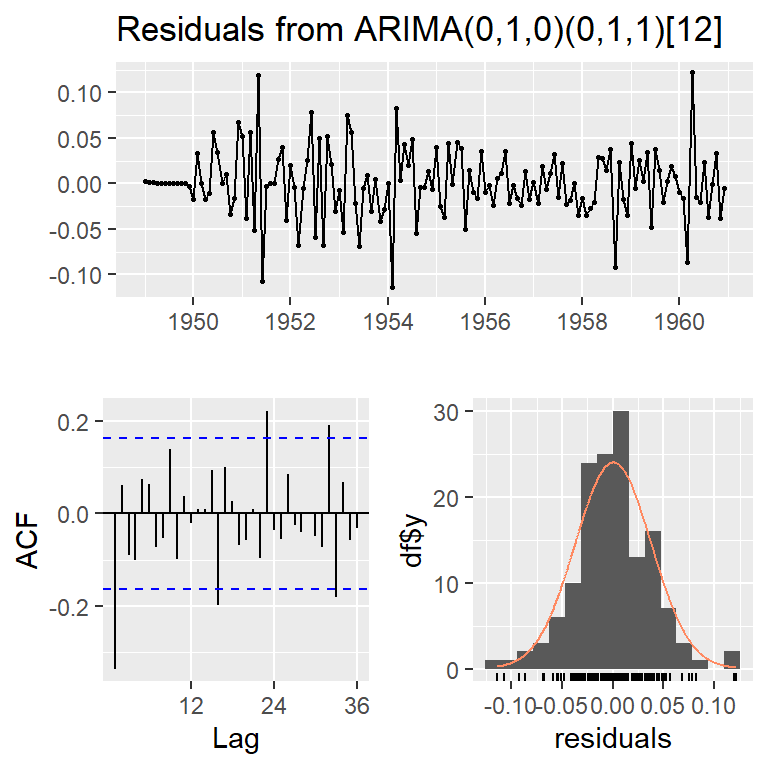 mod2a <- Arima(log(AirPassengers), c(1, 1, 0),seasonal = list(order = c(0, 1, 1), period = 12))