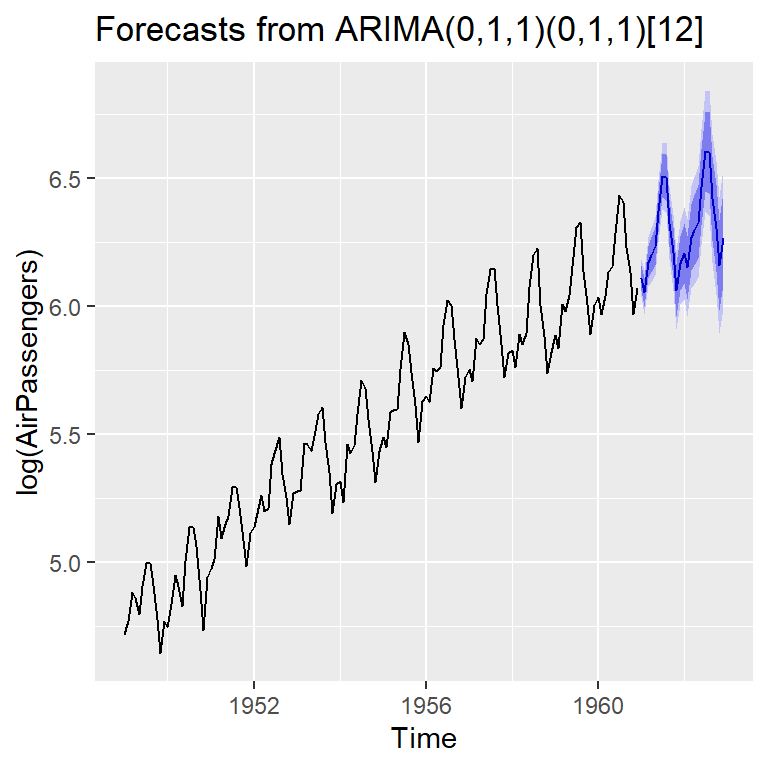 mod2b <- Arima(log(AirPassengers), c(0, 1, 1),seasonal = list(order = c(0, 1, 1), period = 12))