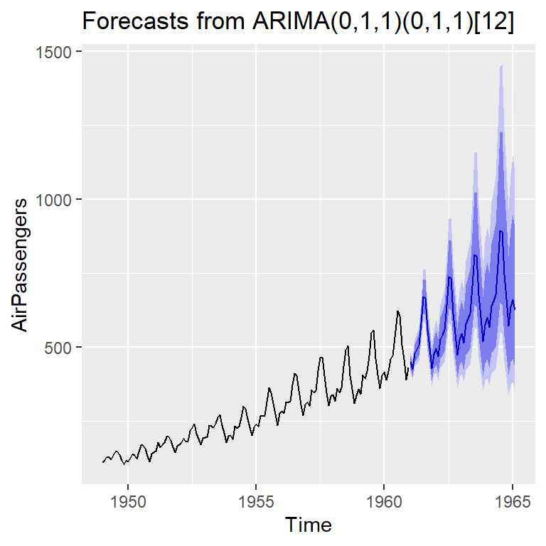 mod2b <- Arima(AirPassengers, c(0, 1, 1),seasonal = list(order = c(0, 1, 1), period = 12),lambda=0)