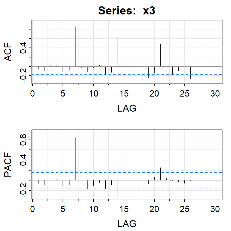 x3 <- sim_sarima(n=TT,model=list(sar=0.6,sma=0.8, nseasons=7, sigma2 = 1))
