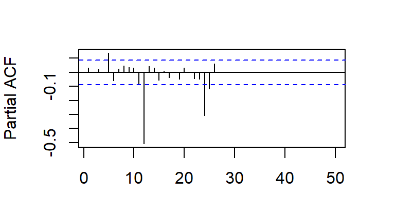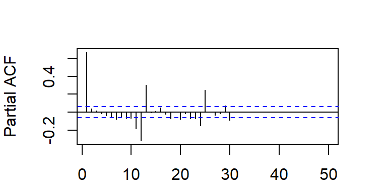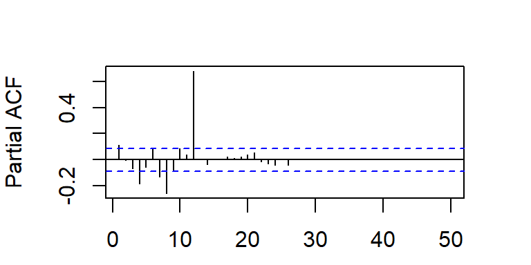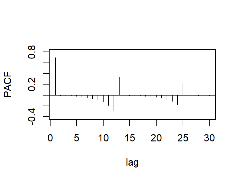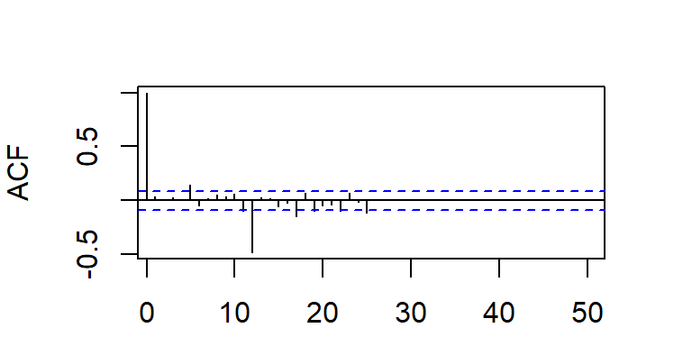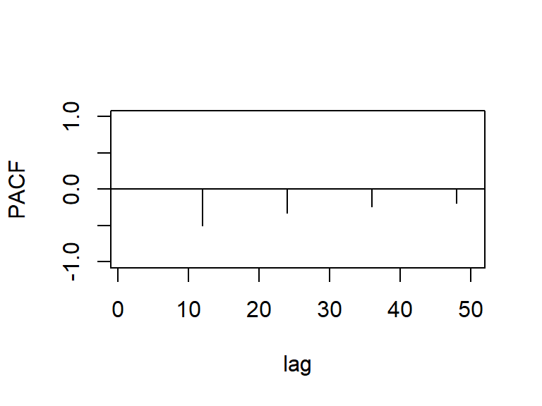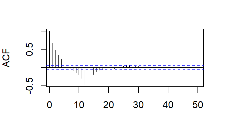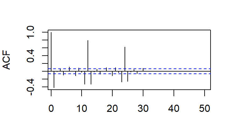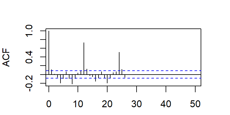 Cuando la ACF muestran estacas en los rezagos \(s, 2s, 3s,...\), que no caen rápidamente a cero, la serie tiene una media no estacionaria y es necesario hacer una diferenciación estacional de longitud \(s\) para obtener una media estacionaria.