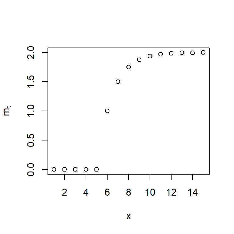 \[m_t = \begin{cases} \omega \frac{1-\delta^{t-T}}{1-\delta}, & t > T, \\ 0, & t \leq T. \end{cases}\]