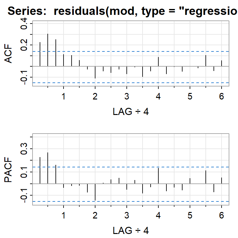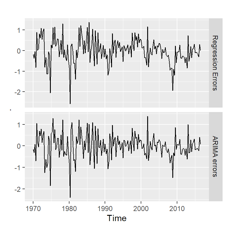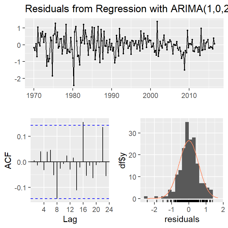 \[Y_t=0.599+ 0.203 X_{t1}+\eta_t\] \[\eta_t=0.692 \eta_{t-1}+\epsilon_t-0.576 \epsilon_{t-1}+ 0.198\epsilon_{t-2},\] \[\epsilon_{t} \sim N(0,0.322)\]