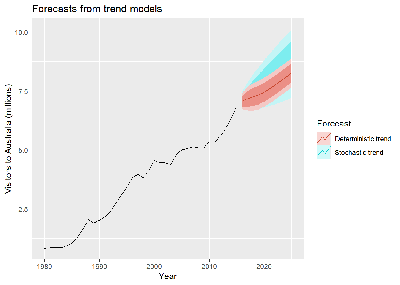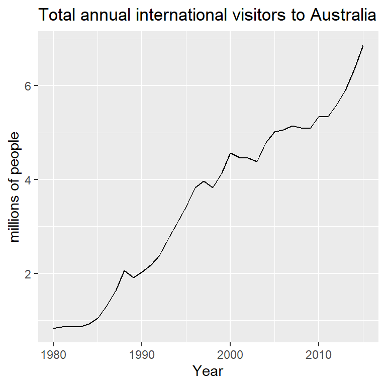 xlab("Year") + ylab("Visitors to Australia (millions)") +