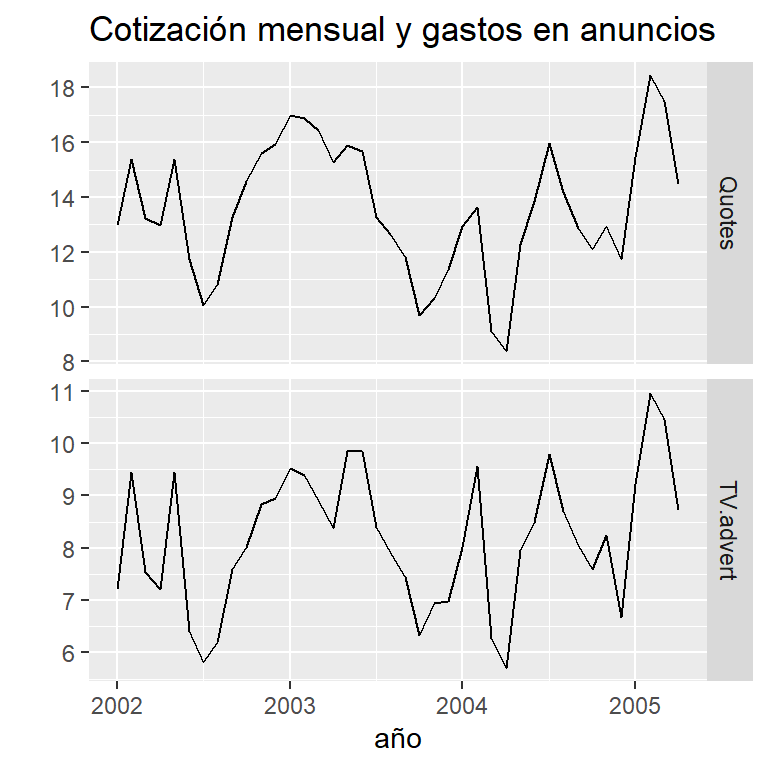 \[Y_t=\beta_0+\beta_1 X_{t,1}+\beta_2 X_{t,2}+...+\beta_p X_{t,p}+\epsilon_t, ~~t=1,...,T,\] en donde \(\left\lbrace \epsilon_t \right\rbrace\) es ruido blanco Gaussiano.