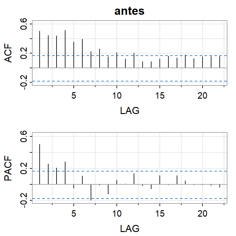 \[\phi(B) (1-B)^d \eta_t=\theta(B) \epsilon_t,\] con ruido blanco \(\left\lbrace \epsilon_t \right\rbrace\).