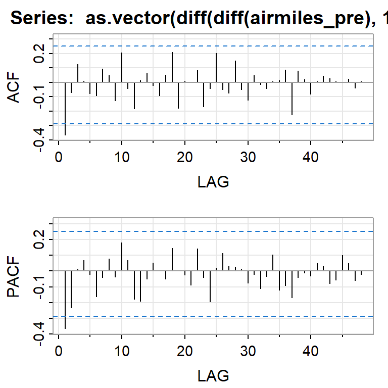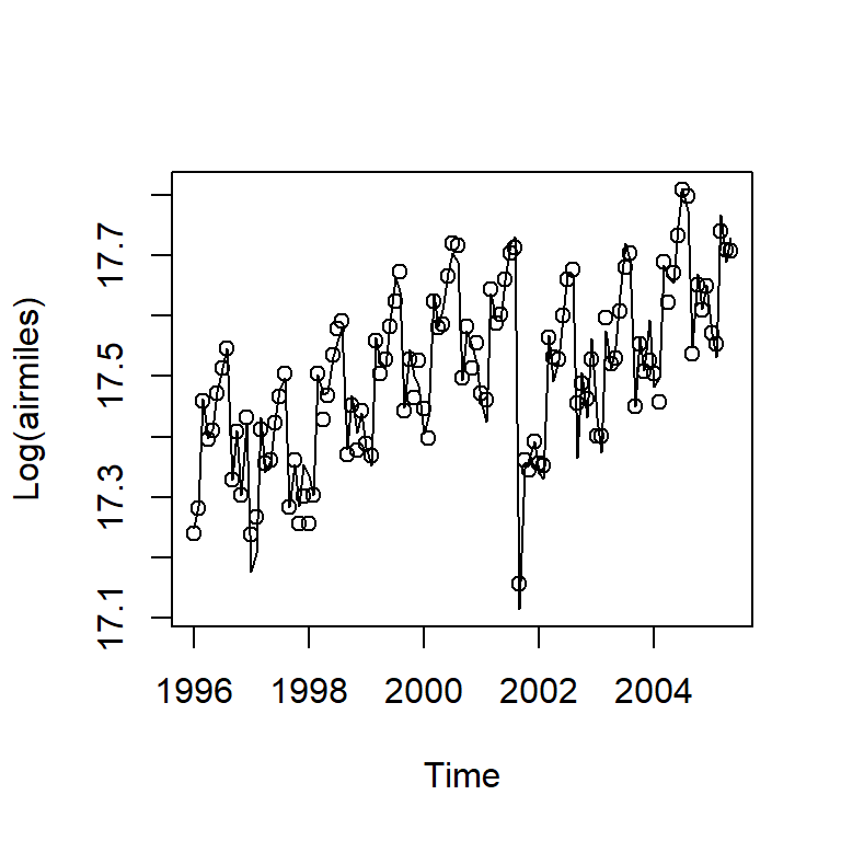 arimax(x = log(airmiles), order = c(0, 1, 1), seasonal = list(order = c(0, 1,