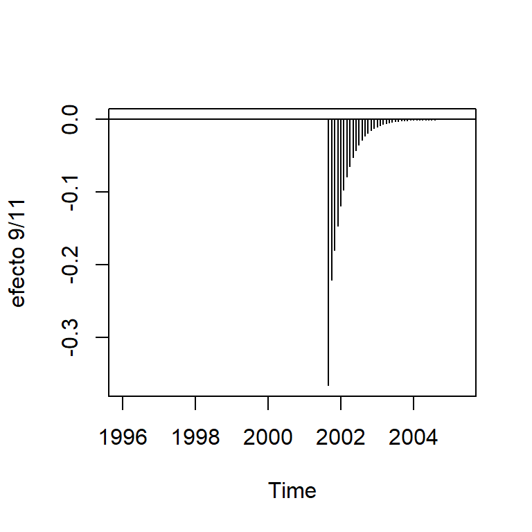 Por lo que este modelo para intervención es utilizado \[m_t = \omega_0 P_t^{(T)} + \frac{\omega_1}{1-\omega_2 B}P_t^{(T)},\] donde \(T\) es septiembre de 2001. \(\omega_0+\omega_1\) representa el efecto del mes y \(\omega_1 \omega_2^k, k=0,1,2,...\) representa el efecto de decaimiento exponencial.