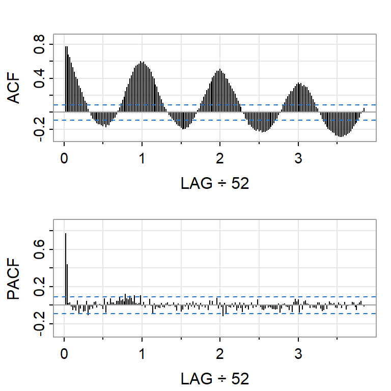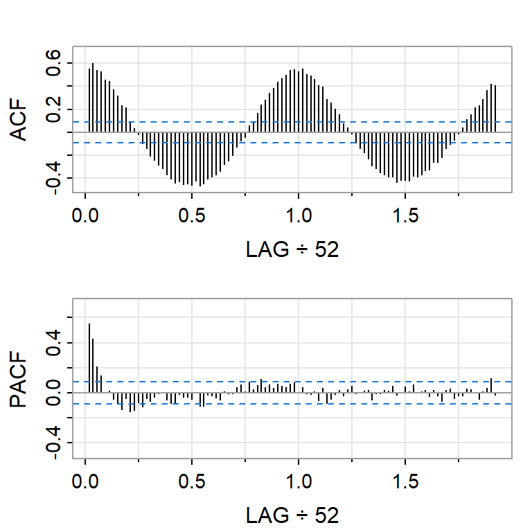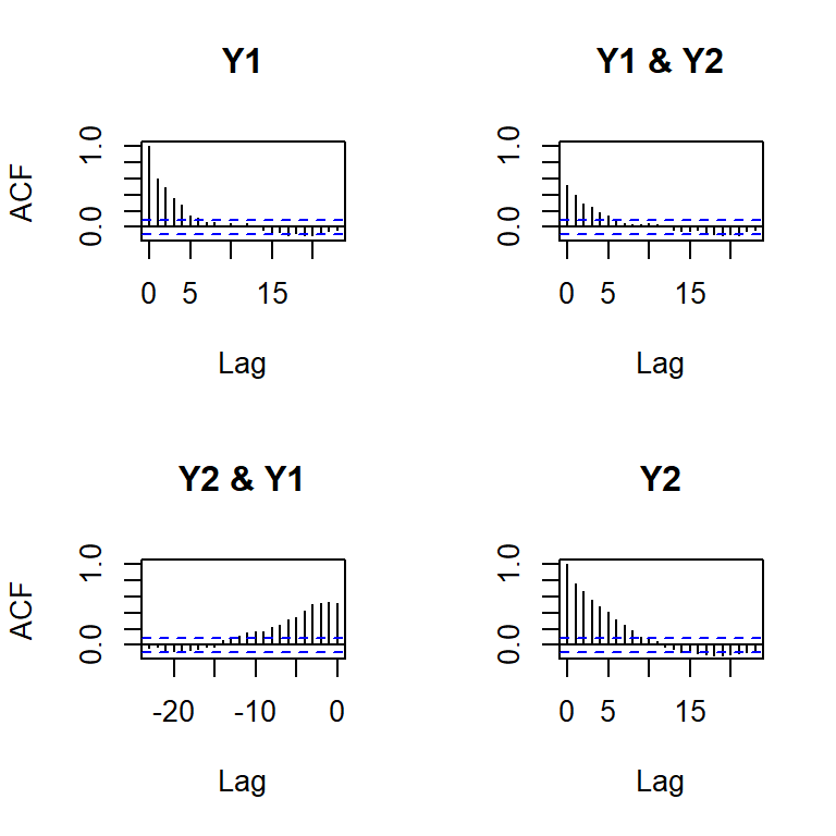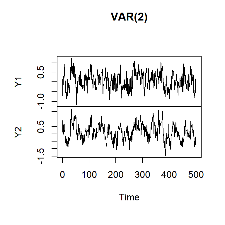 0.02, 0.1), nrow = 2)simVAR2 <- VARMAsim(nobs = 500, arlags = c(1, 2), phi = cbind(Phi_1, Phi_2), sigma = Sigma)names(simVAR2)[1] "series" "noises"