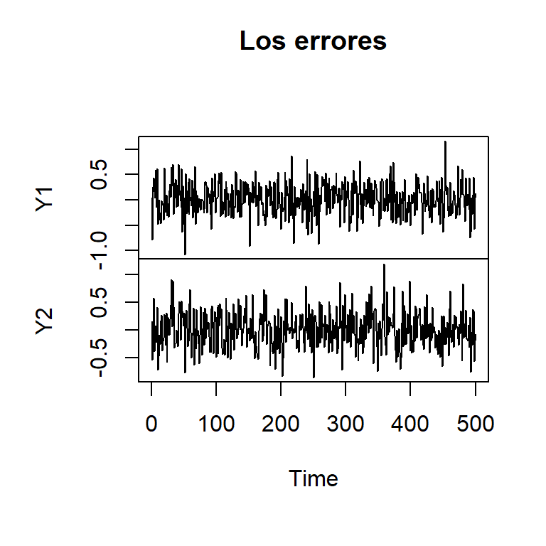 simVAR2_errores <- ts(simVAR2$noises, names = c("Y1", "Y2"))plot(simVAR2_errores, main = "Los errores", col = 1:2)