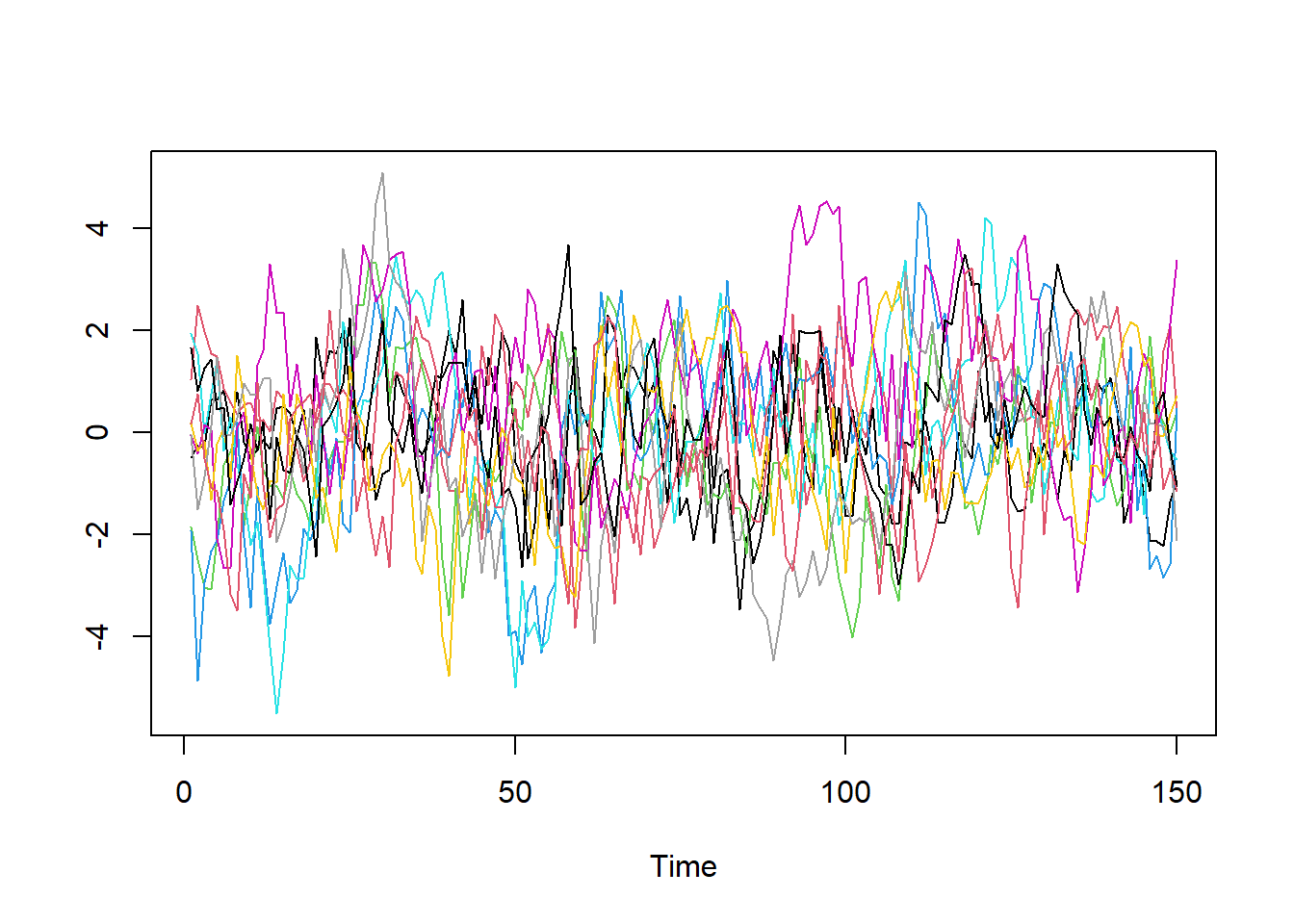 Ejercicio 4.2 Genere \(10\) veces un proceso AR(1) con errores como ruido blanco guassiano de longitud \(150\) observaciones con \(\phi_1=0.8\) y \(\sigma_a^2=1\).