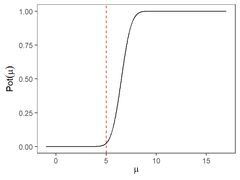 Para contrastar estas hipótesis se va a rechazar \(H_{0}\) si \(\left\lbrace \bar{X}<0\right\rbrace\). Obtenga la función potencia para todos los valores de \(\mu\) dentro de \(\Omega\).