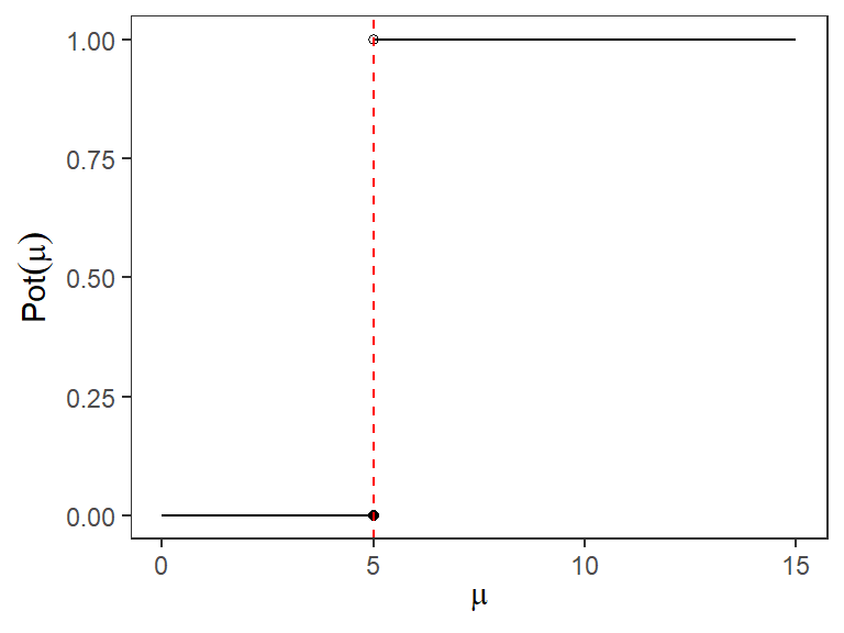 Solución: En este caso todo el espacio paramétrico \(\Omega\) se compone solo por dos valores de \(\mu\): \(\mu = 1\) y \(\mu = -1\). Por lo tanto debemos calcular la Potencia para cada uno de estos valores. Empezaremos por la Potencia en \(\mu = 1\):