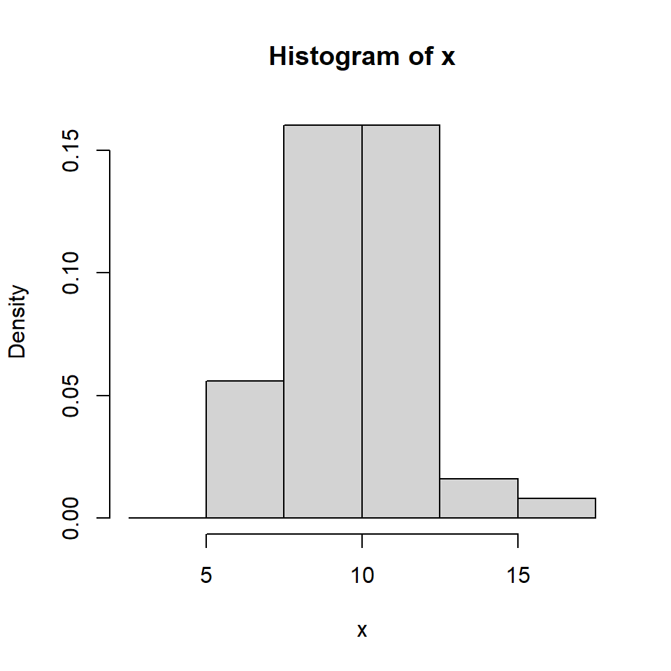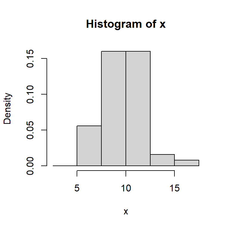 Suponga que queremos estimar la densidad de un \(x \in B_j\). La estimación usando el histograma para estimar \(f(x)\) es \[\hat{f}_h(x)=\frac{1}{nh} \sum_{i=1}^n \sum_{j} I(X_i \in B_j) I(x \in B_j)=\frac{1}{nh} \sum_{i=1}^n I(X_i \in B_j)\]