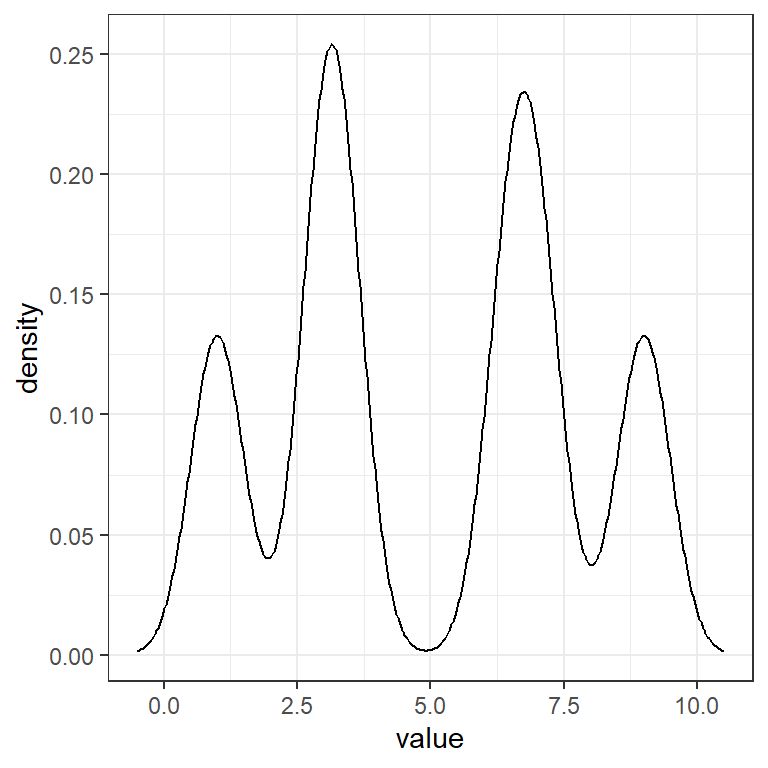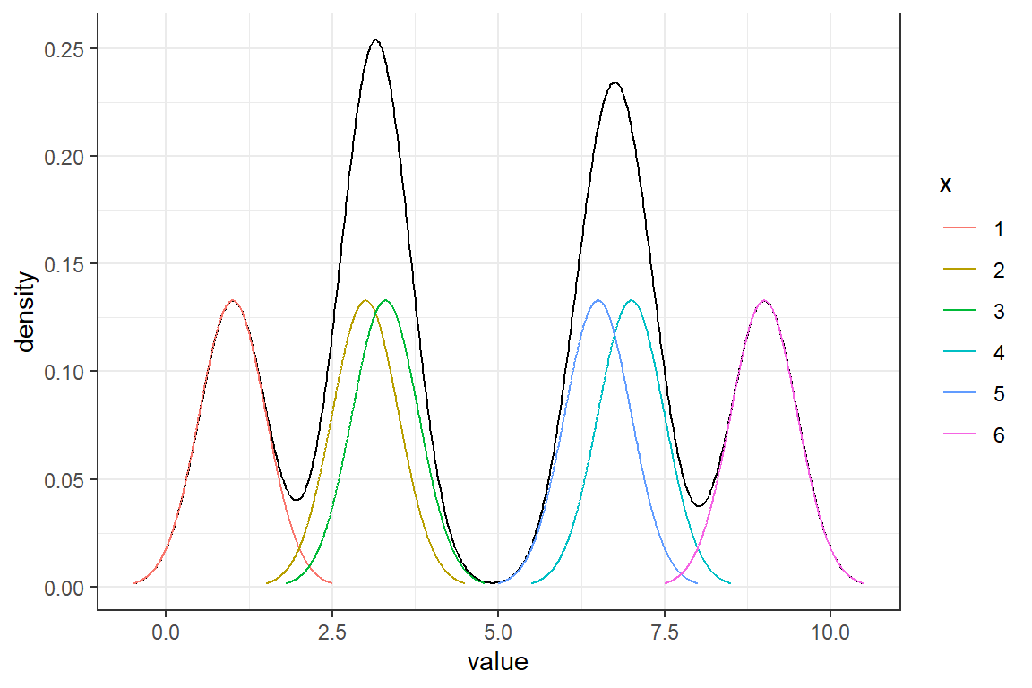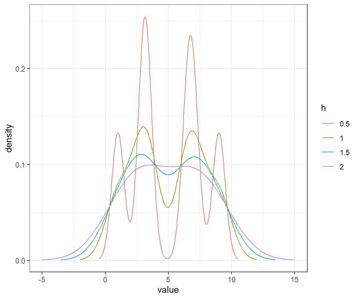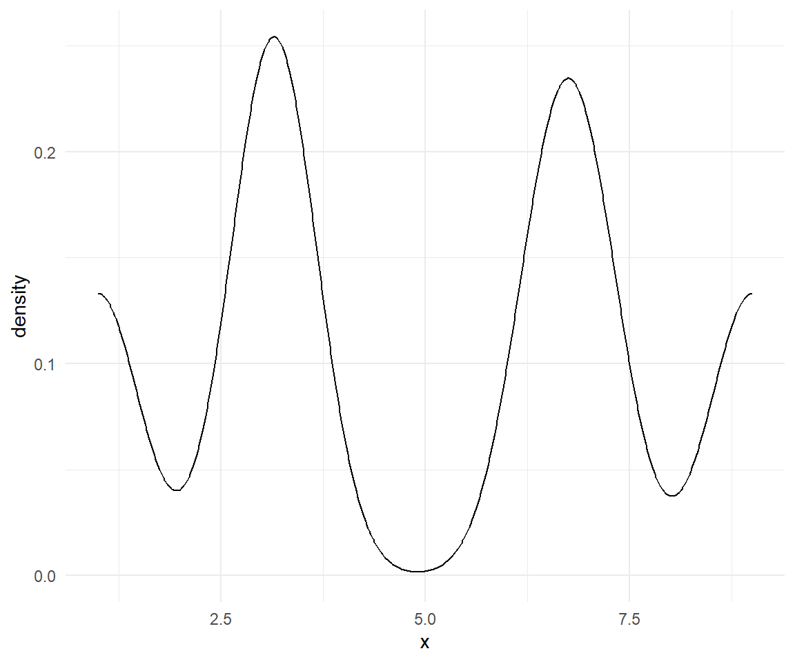 Ejemplo: Para una muestra de una población con distribución desconocida: \((1,3,3.3,7,6.5,9)\), estime la densidad usando el kernel gaussiano y \(h=0.5\).