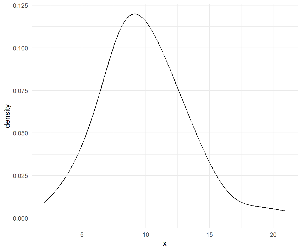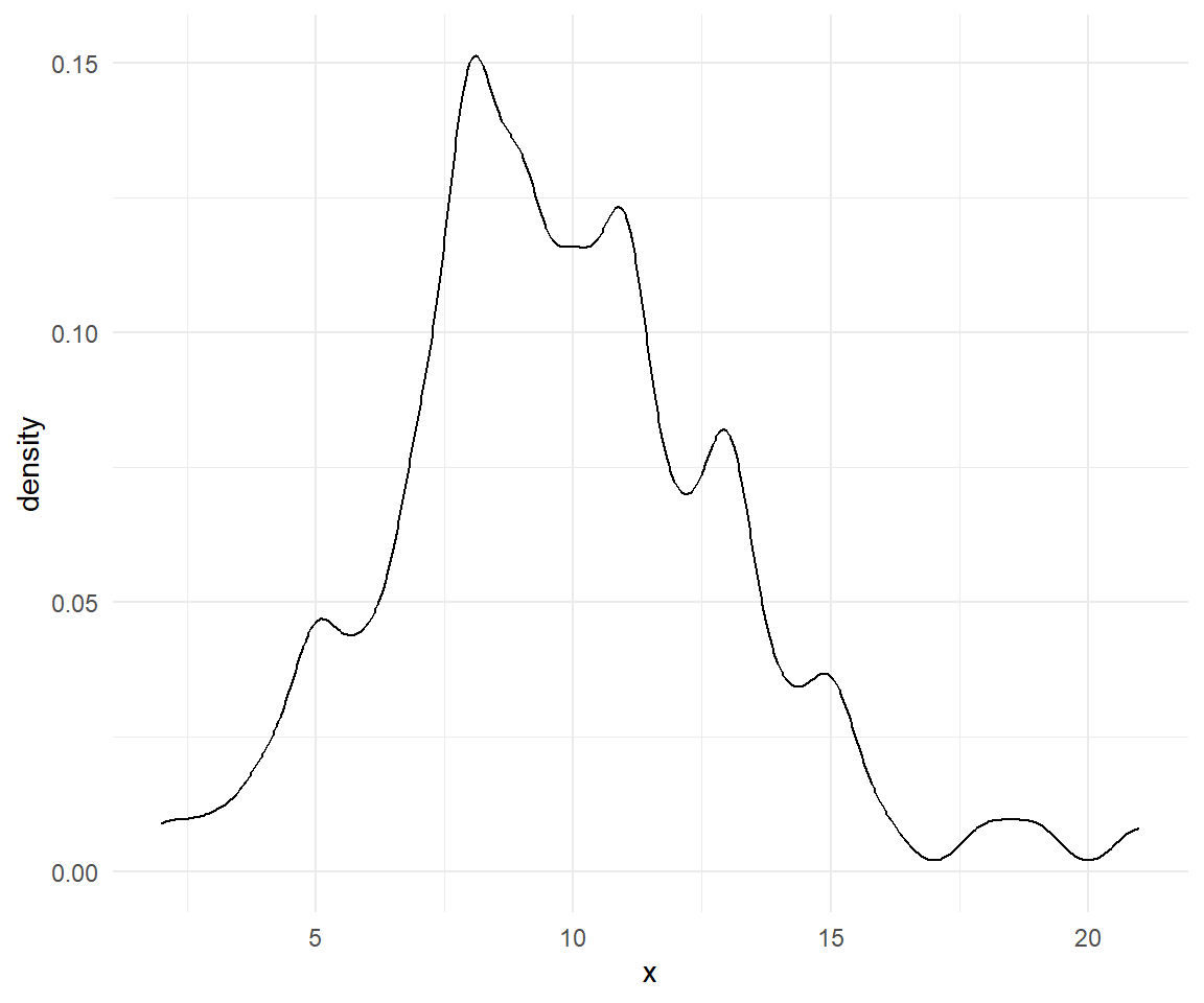 Ejemplo: Para una muestra de una población con distribución desconocida: \((1,3,3.3,7,6.5,9)\), estime la densidad usando el kernel triangular y \(h=0.5\).