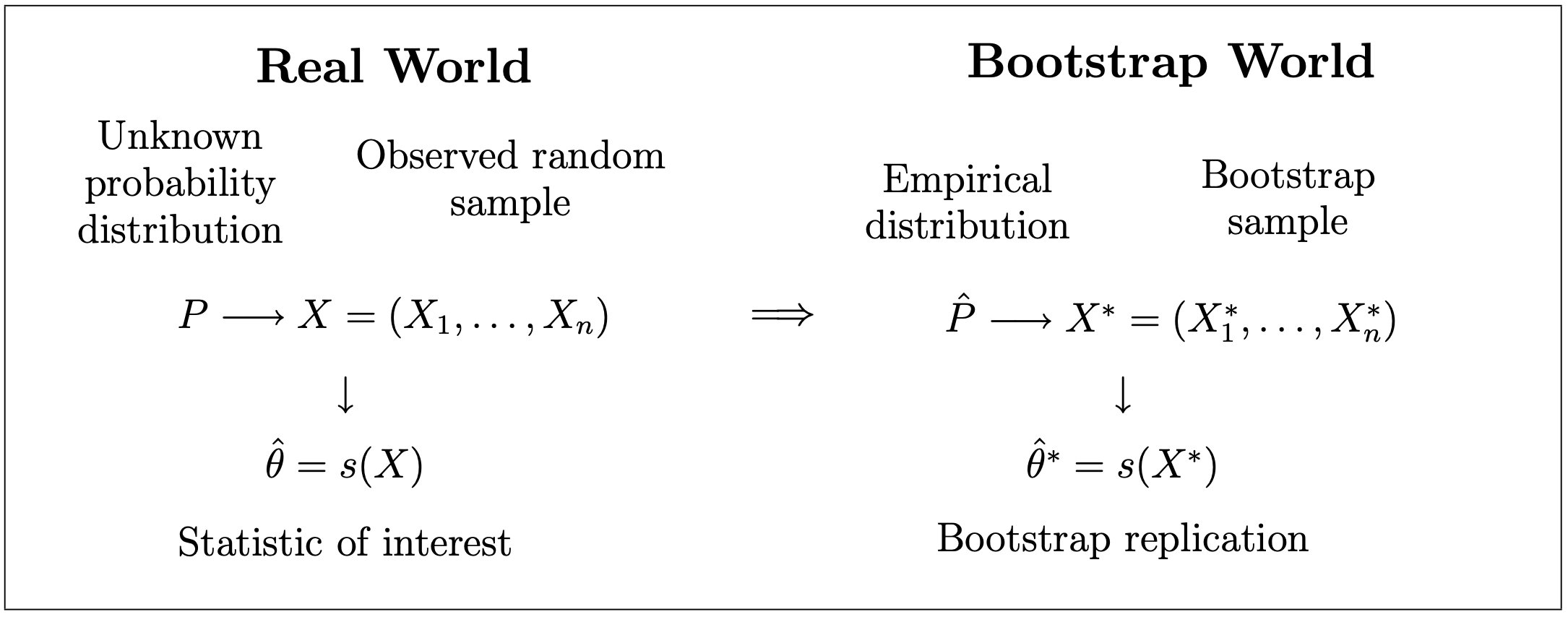 Note que esto significa que las \(n\) observaciones se selecciona con reemplazo de la distribución \(\hat{P}\), o sea los datos originales \(\left\lbrace X_1,...,X_n \right\rbrace\).