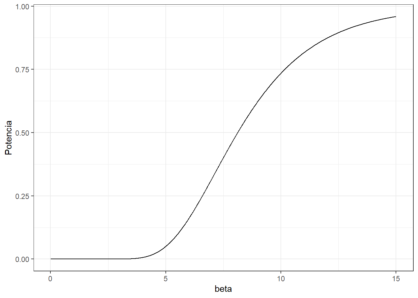 La función potencia se define como la probabilidad de rechazar la hipótesis nula dado un valor de \(\beta\), o sea \[\operatorname{Potencia}(\beta)=\operatorname{P}\left(\frac{2}{\beta_0}\sum{X_i}>\chi^2_{(1-\alpha_0,2n)}|\beta\right)=\operatorname{P}\left(\frac{2}{5}\sum{X_i}>\chi^2_{(0.95,20)}|\beta\right)\] \[=\operatorname{P}\left(\sum{X_i}>\frac{5}{2}\chi^2_{(0.95,20)}|\beta\right)\]